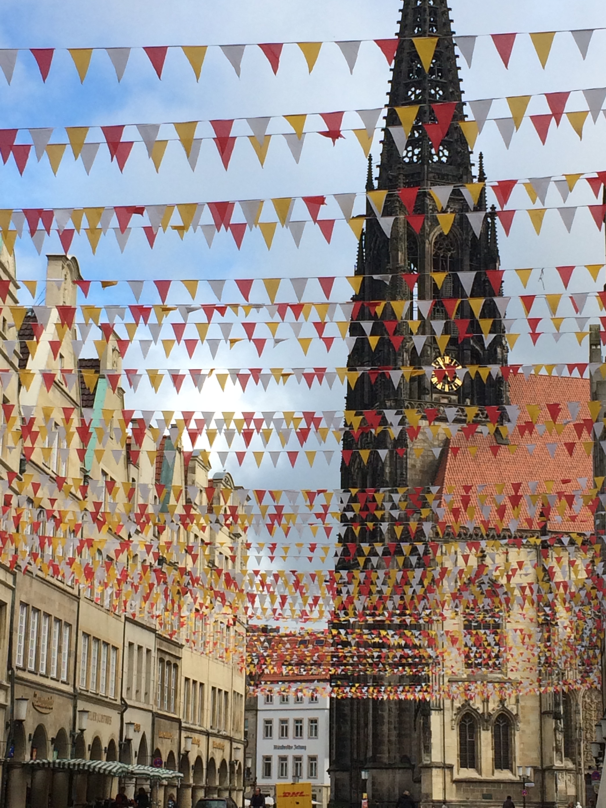 Nach fast einem Jahr haben wir es endlich wieder in die schöne Stadt in Westfalen geschafft. Genau der richtige Ort, um ein paar spätsommerliche Tage voller Genuss und mit vielen lebendigen Erinnerungen an vergangene Tage zu verbringen. Schon bei unserer Ankunft fühlten wir uns, als sei man nie weg gewesen. An einem Sonntagnachmittag, an dem die letzten Teilnehmer und Zuschauer des Münster Marathons sich gerade aus der Stadt verabschiedeten und die Streckenposten die letzten Absperrungen öffneten, um uns den Weg zum Prinzipalmarkt frei zu machen, empfingen uns dort jede Menge bunte Wimpel, die im Wind umher trieben.