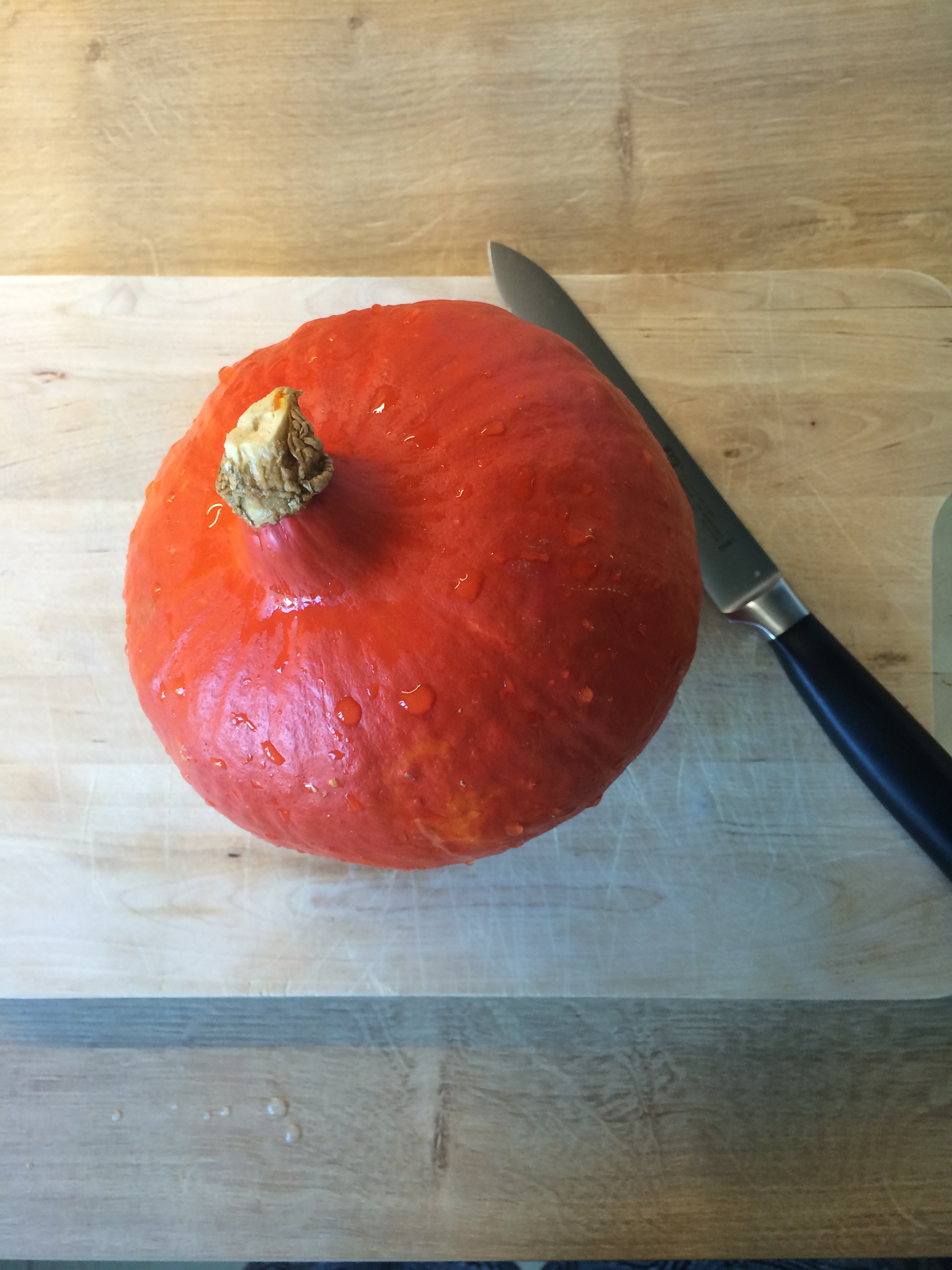 Am besten kauft ihr auf dem Markt, im Gemüseladen oder Supermarkt einen Hokkaido-Kürbis. Ich nehme hier gerne einen Bio-Kürbis in mittlerer Größe. Zuhause wird der kleine Runde nur grob geputzt: Dreck wird abgewaschen oder größere Unebenheiten an der Schale werden entfernt, aber ansonsten bleibt die Schutzhülle dran und der Hokkaido wird in kleinere Stücke zerteilt. Die weichen Fäden im Inneren kommen ebenfalls weg. Die Kerne könnt ihr aufheben und rösten und später wieder zur Suppe geben oder eventuell für ein selbst gebackenes Brot verwenden.