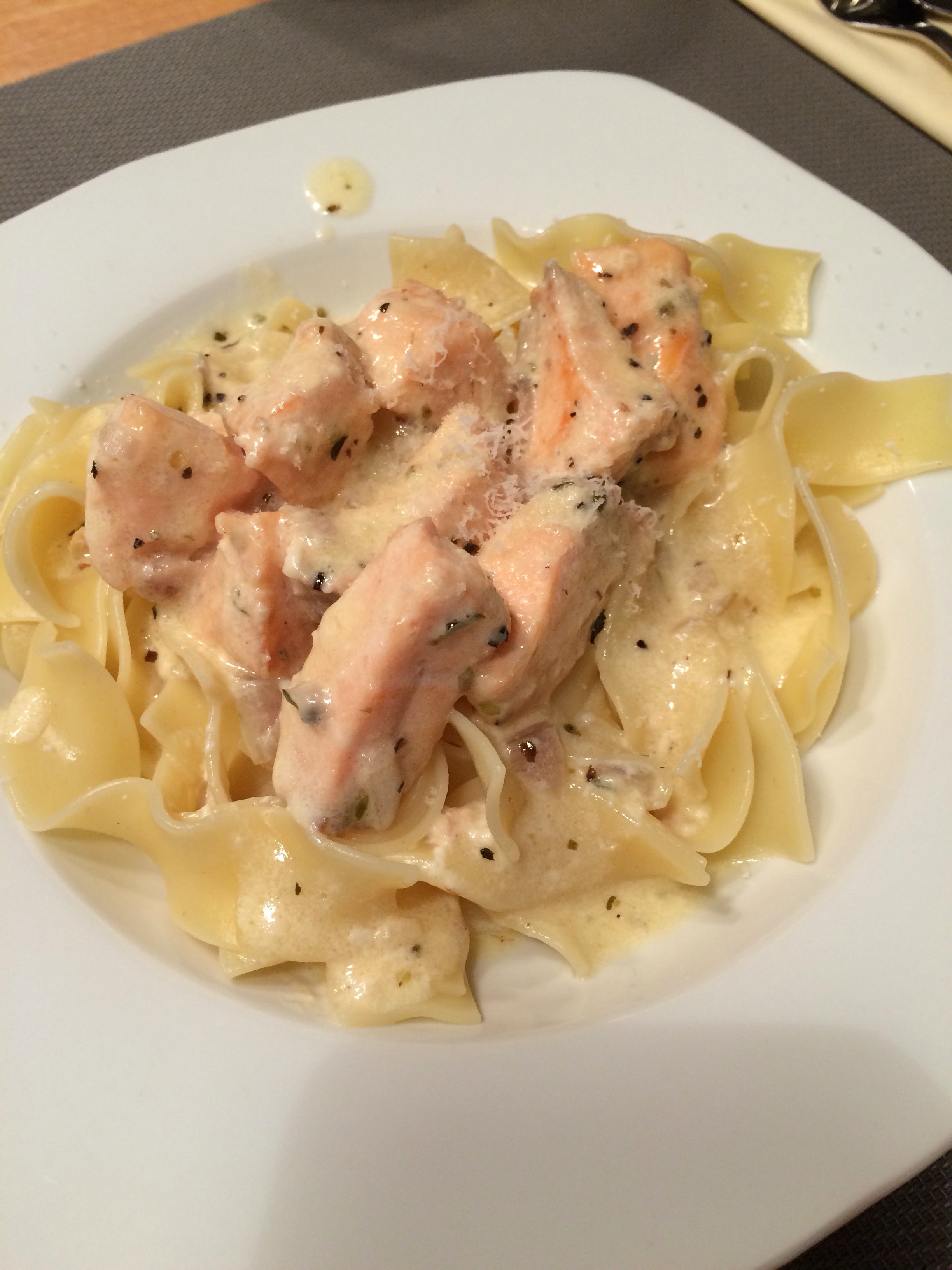 Ist der Fisch noch glasig, lösche ich ihn mit einem Weißwein ab und lasse das Ganze etwas reduzieren, bevor ich Sahne dazugebe. Nun sollte dir ausreichend Zeit mitbringen, damit die Sauce etwas ein reduzieren kann. Darauf schmecke das Ganze mit Salz und Pfeffer und Kräutern der Provence ab und reibe frischen Parmesan in die Sauce, damit sie besonders sämig wird. Auf den Teller kommt der Fisch mit frischen Tagliatelle und einem Glas trockenen Grauburgunder.