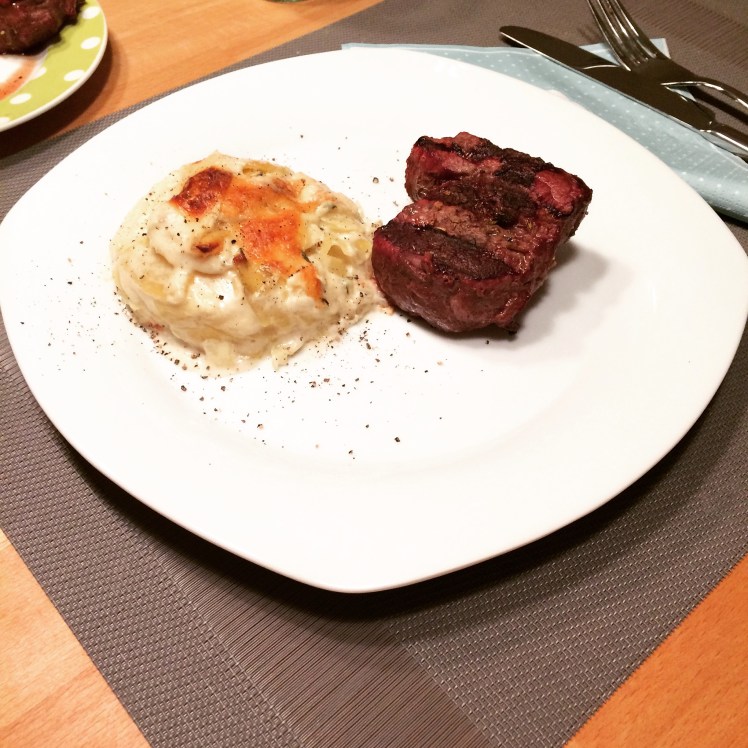 Nun sieht es an einem wie von vielen Samstagen bei uns so aus, dass das bereits geschnitte Steak gerade mit Pfeffer und einem unserer Lieblingssalze eingerieben wird – mal einfach Merrsalz, Meersalz mit mediterranen Kräutern oder einem Räuchersalz. Dabei finde ich die mallorquinischen Salze von Flor de Sal d’es Trenc übrigens ganz großartig. Während das Fleisch die richtige Temperatur bekommt, um es auf den Grill zu legen, ist es Zeit für die Beilagen. Bei den frostigen Temperaturen passen, so finde ich, ein leckeres Kartoffelgratin und ein Kräuterbaguette wirklich hervorragend zum Rinderfilet.