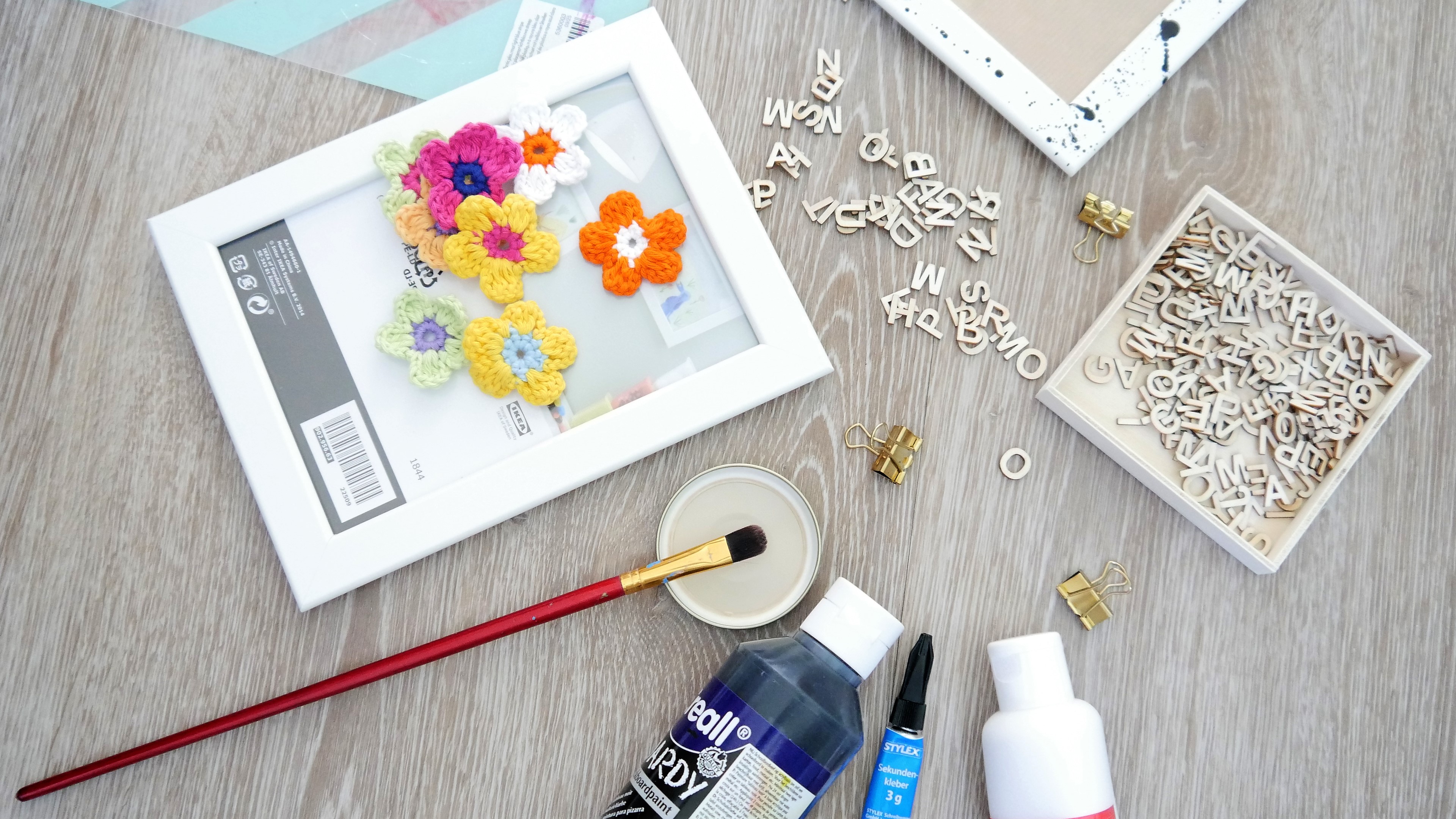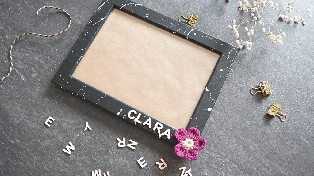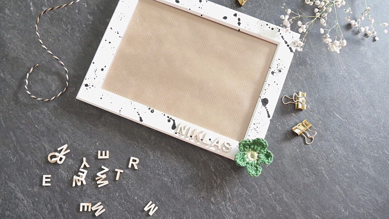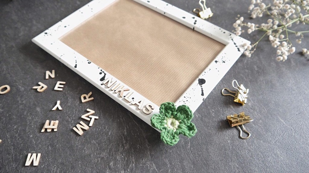 Nun darf der Rahmen kurz trocknen und ihr könnt – bitte ebenfalls vorsichtig – den Namen eurer Wahl aus den Holzbuchstaben gelegt darauf kleben. Ich habe den rechten unteren Rand gewählt und als Verzierung eine Häkelblume daneben befestigt. Und dann seid ihr auch schon fertig.
